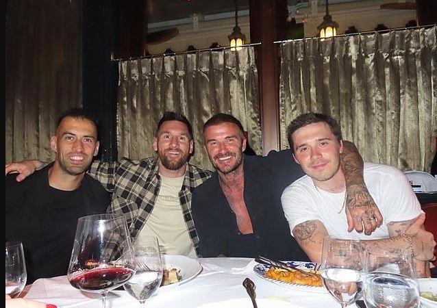 David Beckham, Victoria a Brooklyn vyrazili v pondělí v Miami na večeři s Messim, Busquetsem a jejich partnerkami.