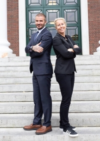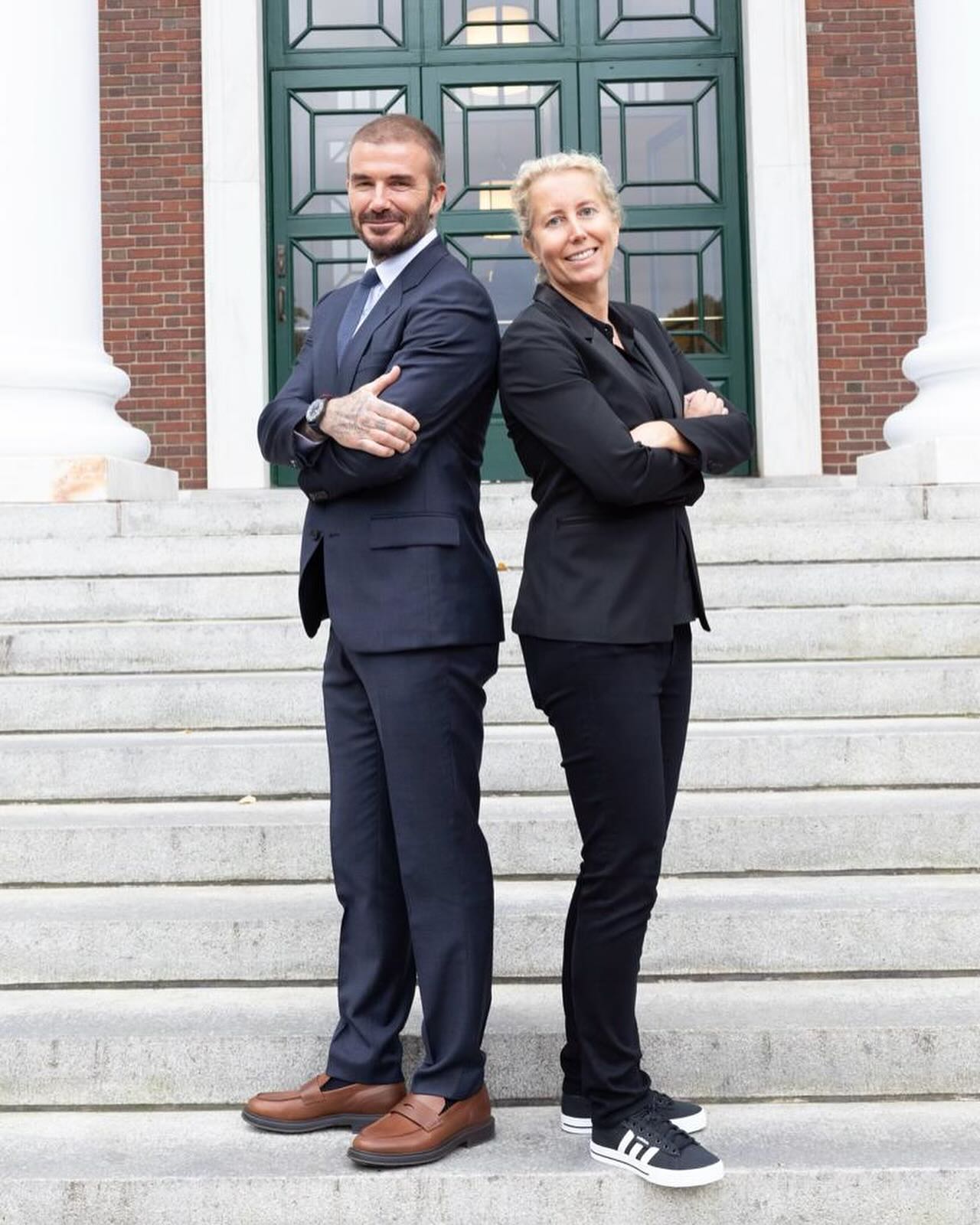 David Beckham navštívil včera studenty na Harvardu, kde mu průvodkyni dělala místní profesorka zaměřující se na sportovní a mediální sektor - Anita Elberse.